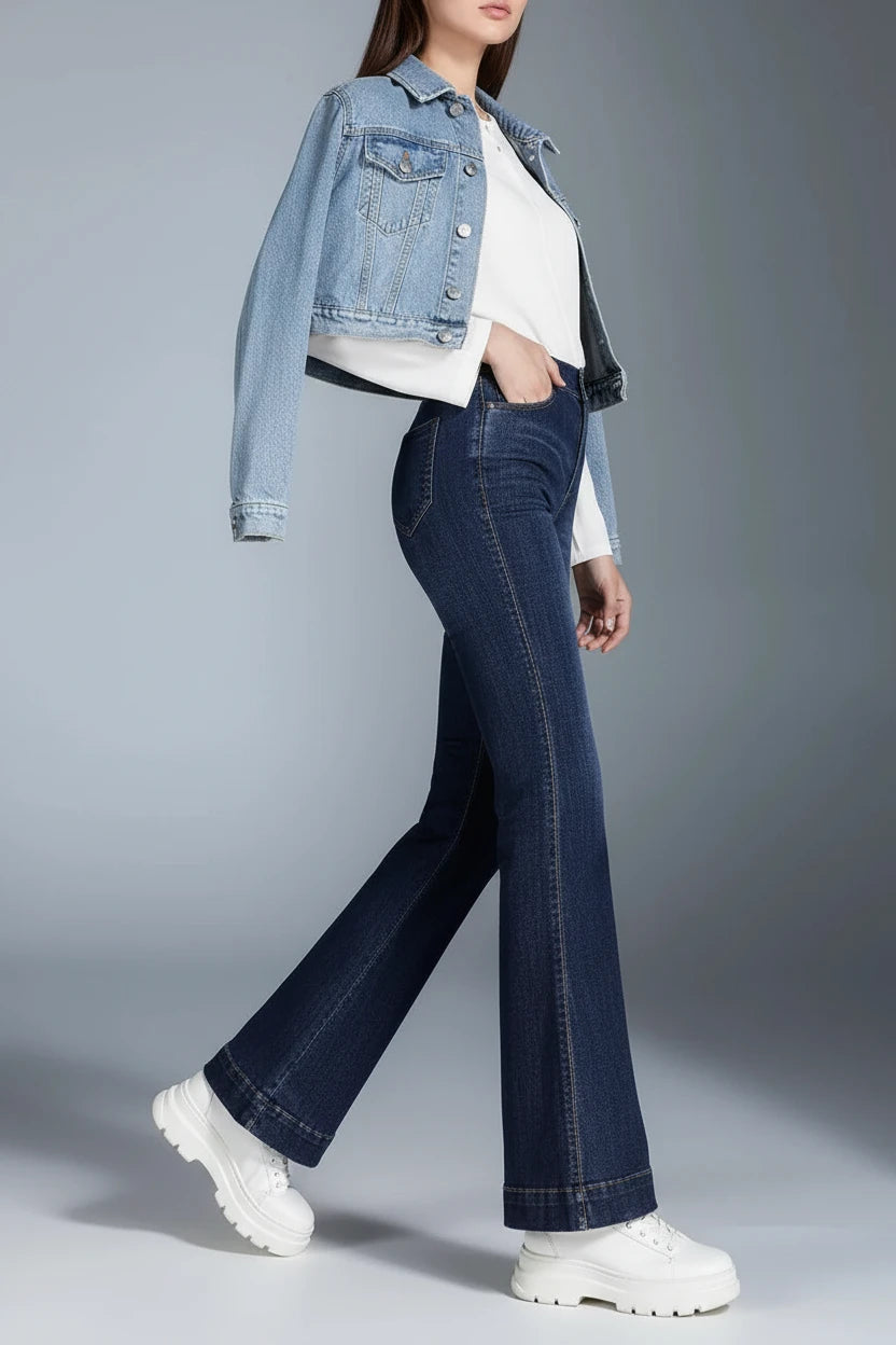 Damskie Spodnie Jeansowe z Bawełny – Wysoki Stan, Elastyczne, Rozszerzane Nogawki