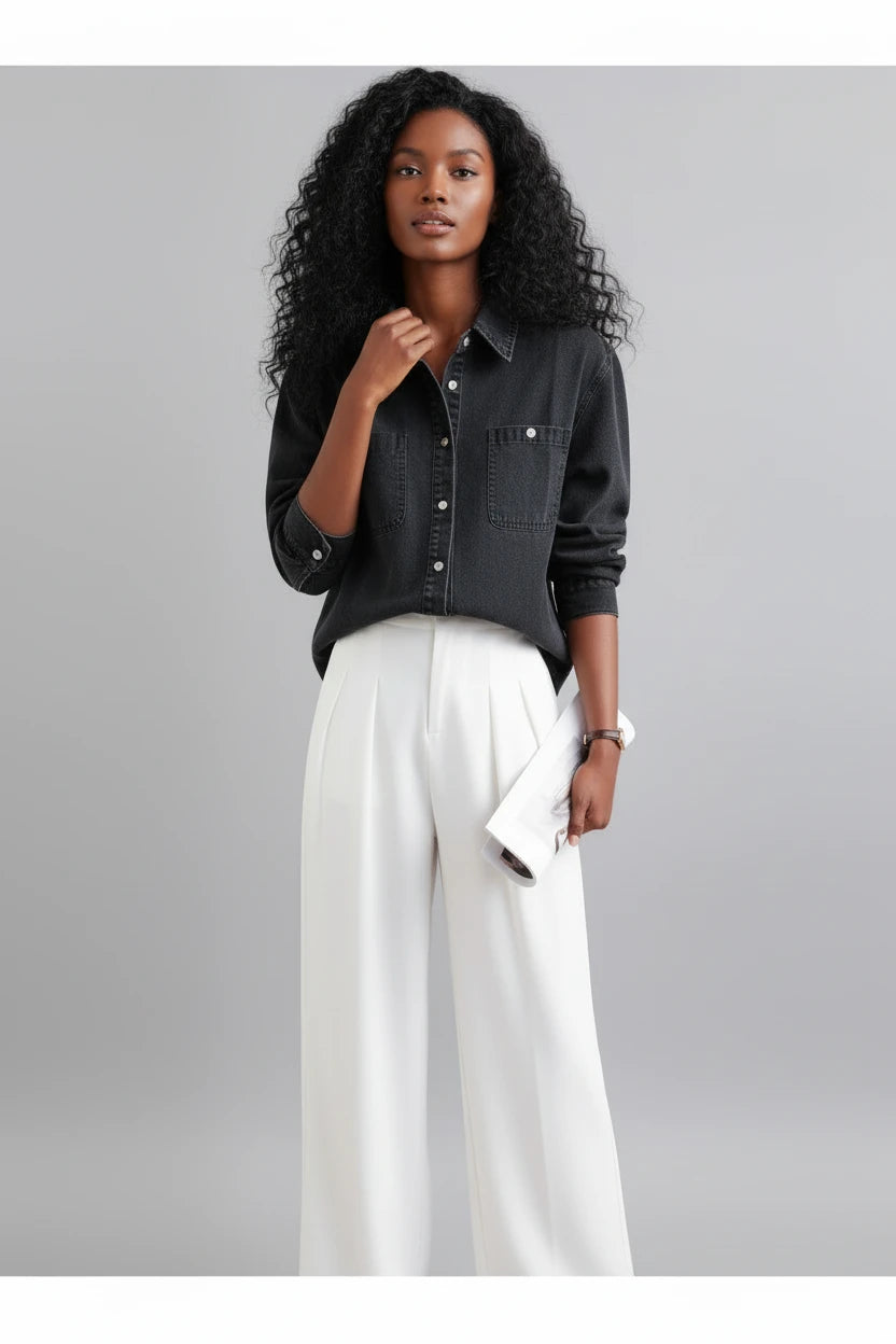 Czarna Cienka Koszula Jeansowa Damska – Streetwear Retro z Długim Rękawem