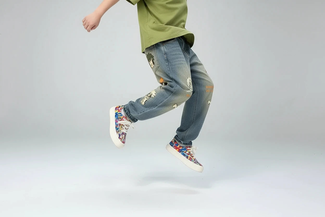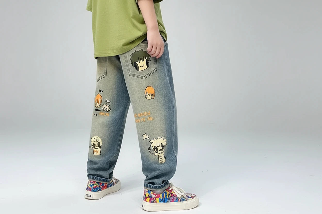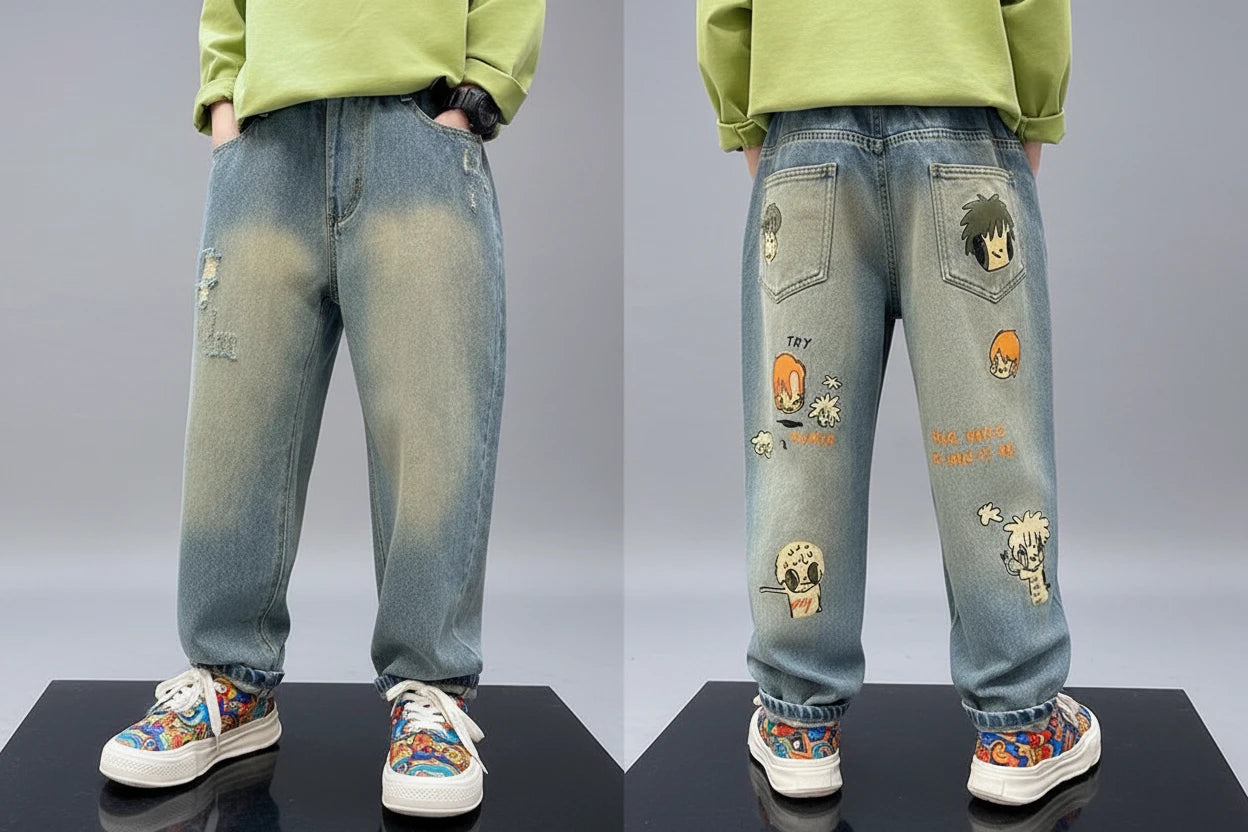 Chłopięce spodnie dżinsowe z nadrukiem cartoon – outdoor
