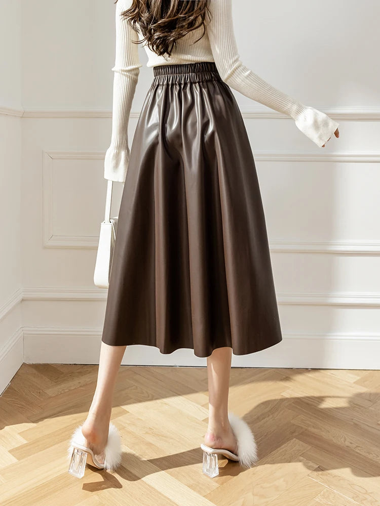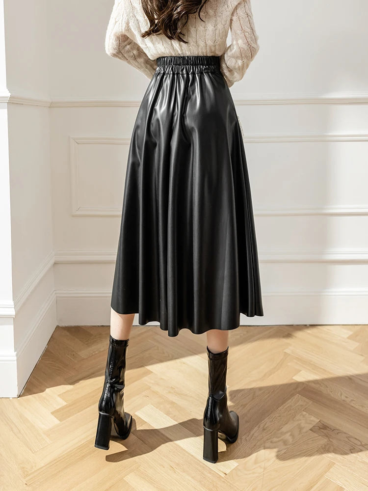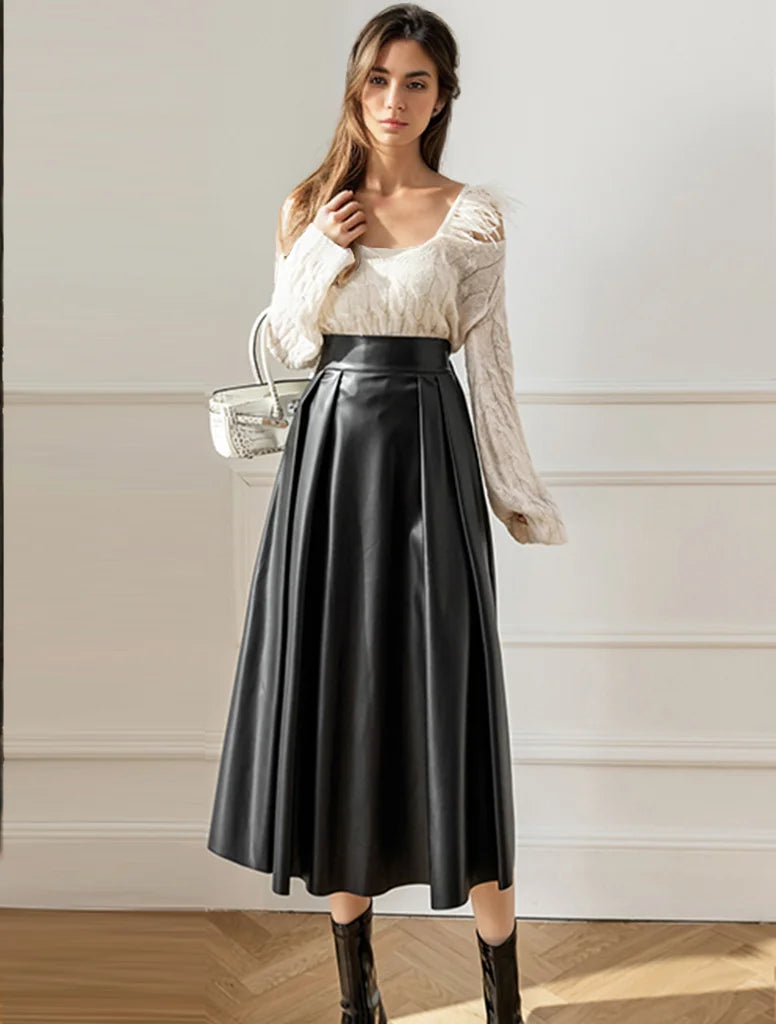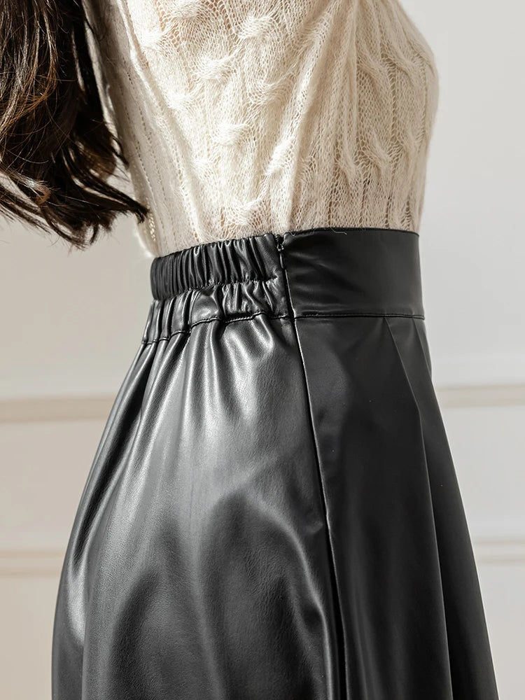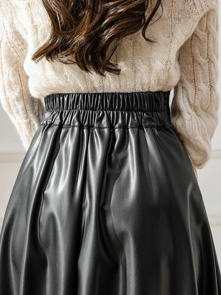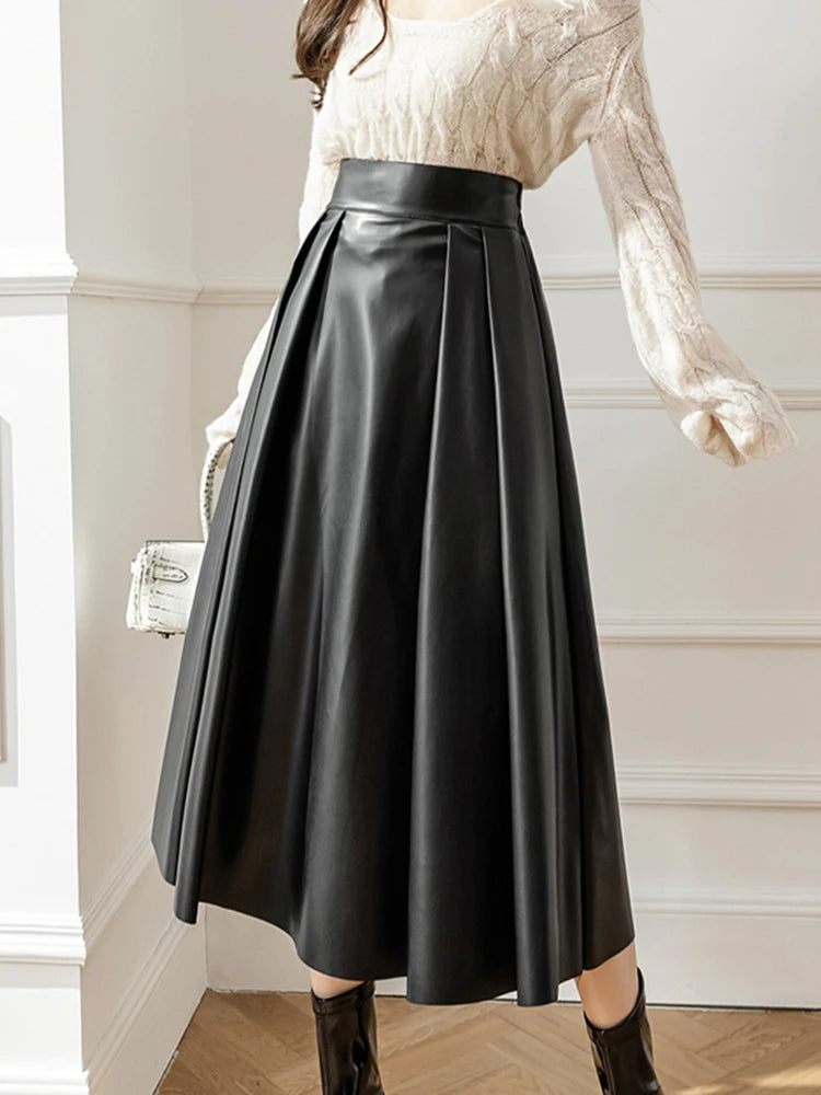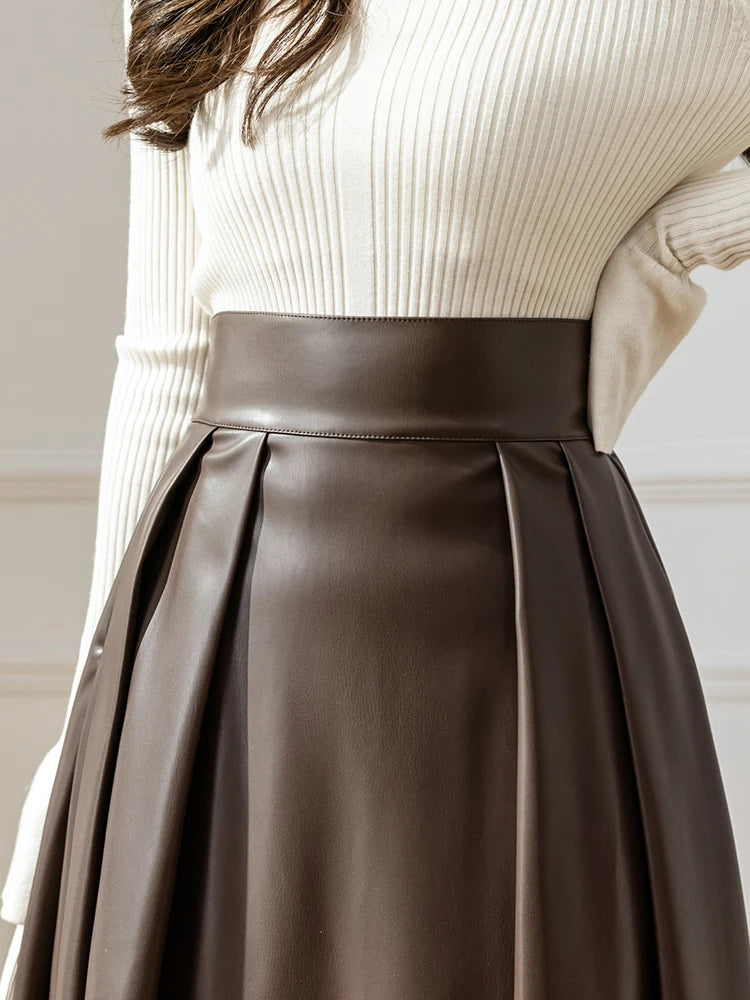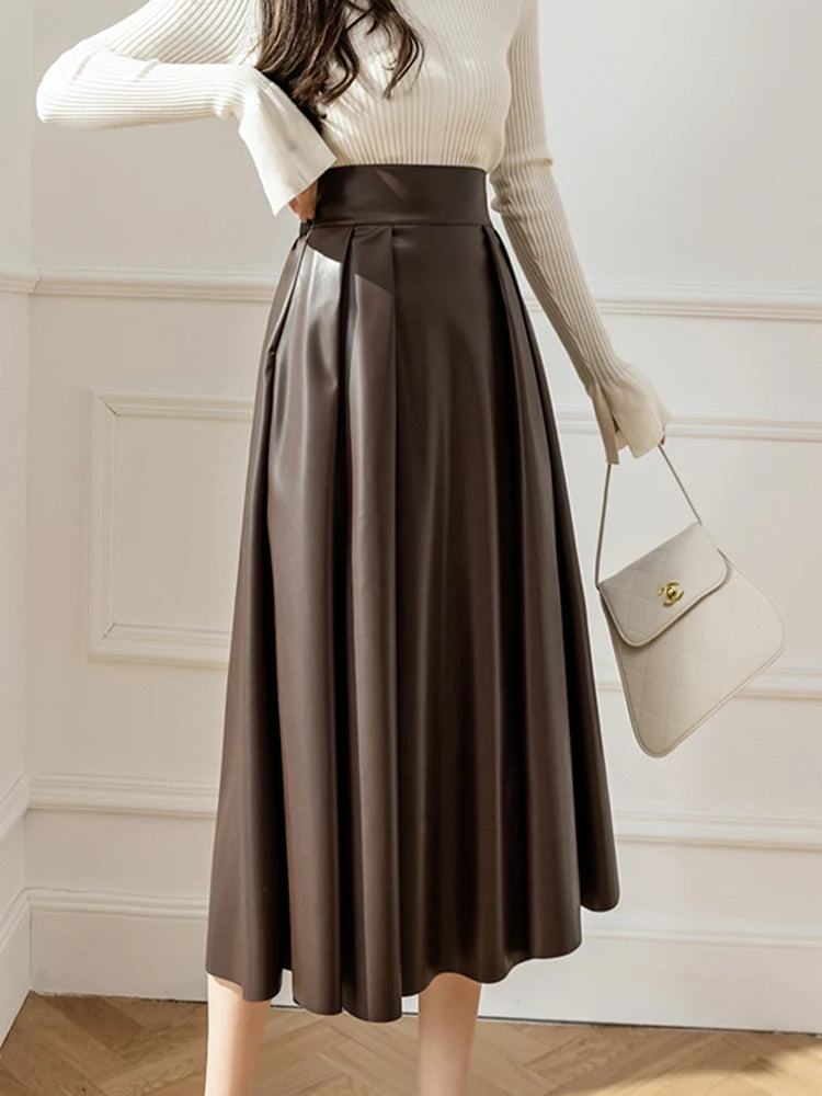 Elegancka Skóra PU Midi Spódnica Plisowana z Wysokim Stanem