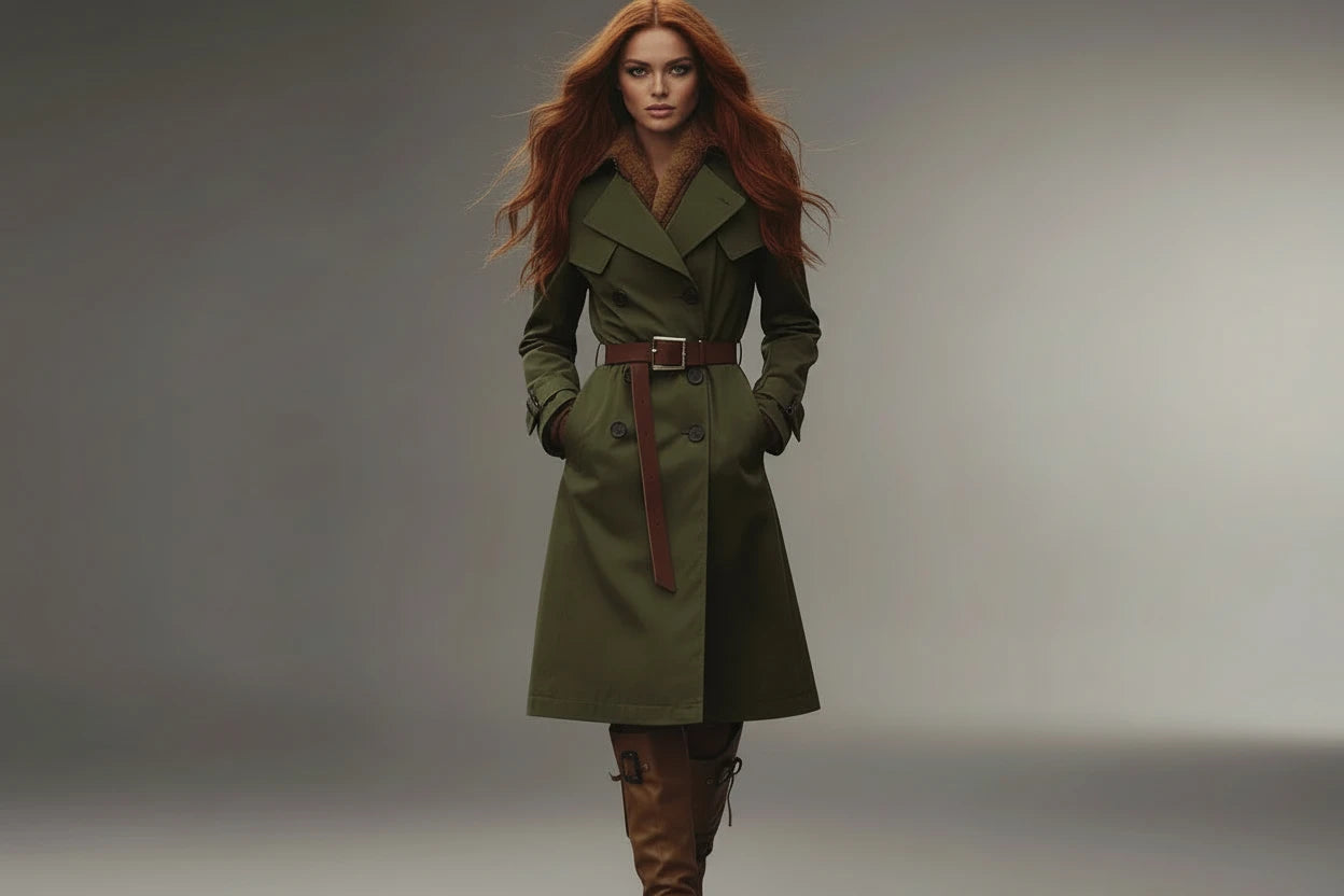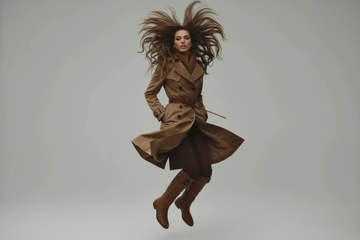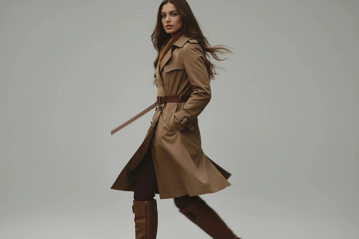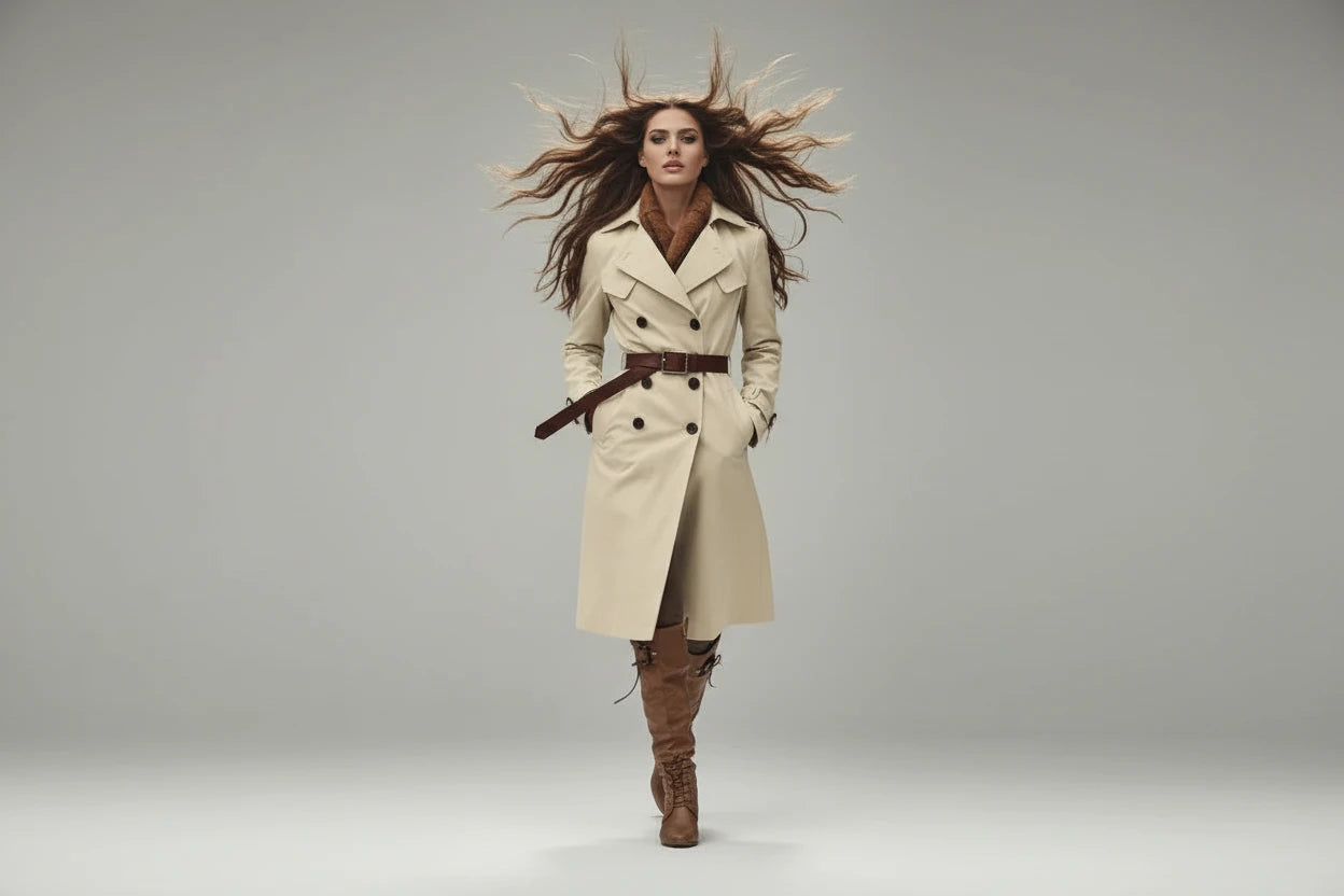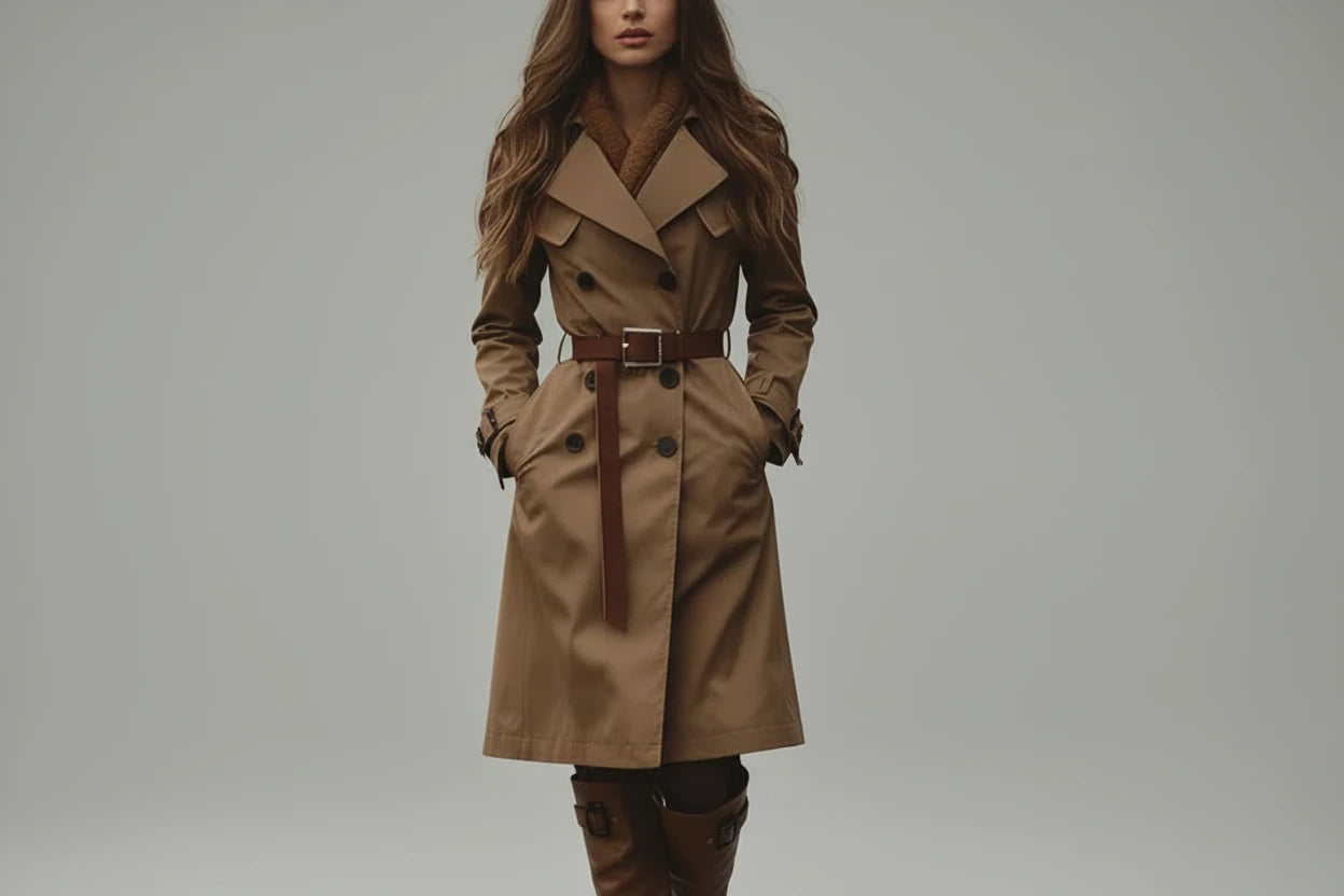 Trencz "ECLIPSE" w gustownej, jesiennej odsłonie, w towarzystwie miękkiego, futrzanego szala i eleganckich, skórzanych rękawiczek. Ten kontrast dodaje stylizacji nutę luksusu i ciepła, podkreślając wszechstronność płaszcza.