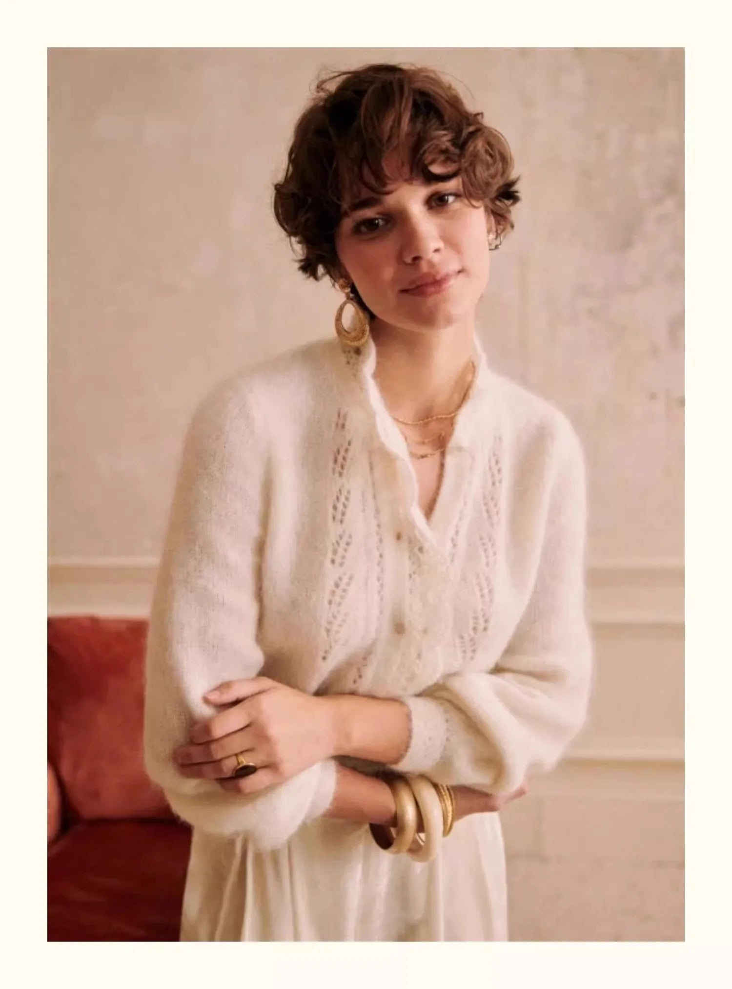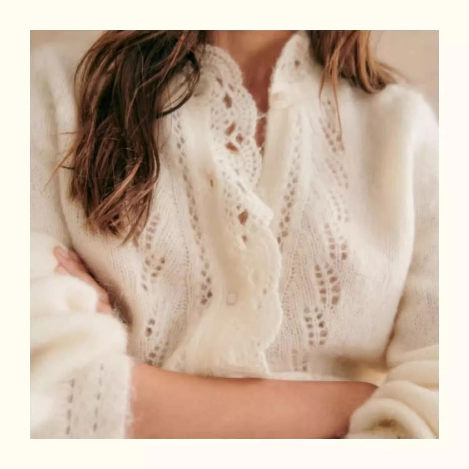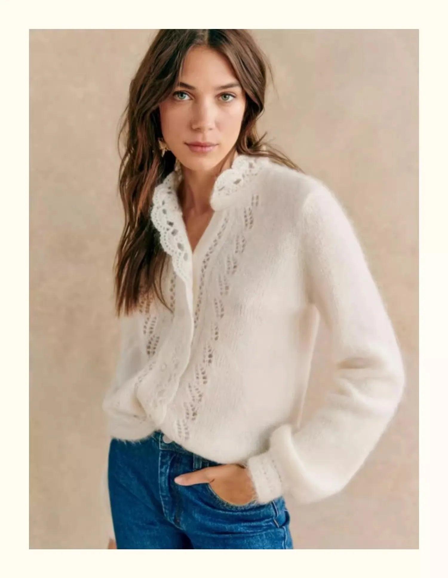 Jest to stylowy, dzianinowy kardigan dla kobiet w retro i eleganckim francuskim stylu. miękki i "kleisty"