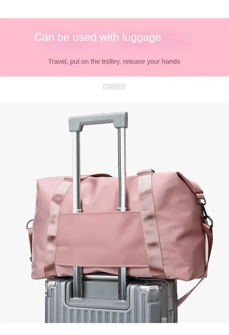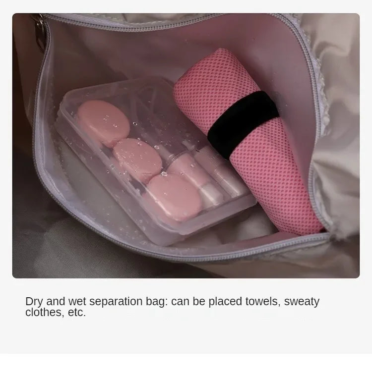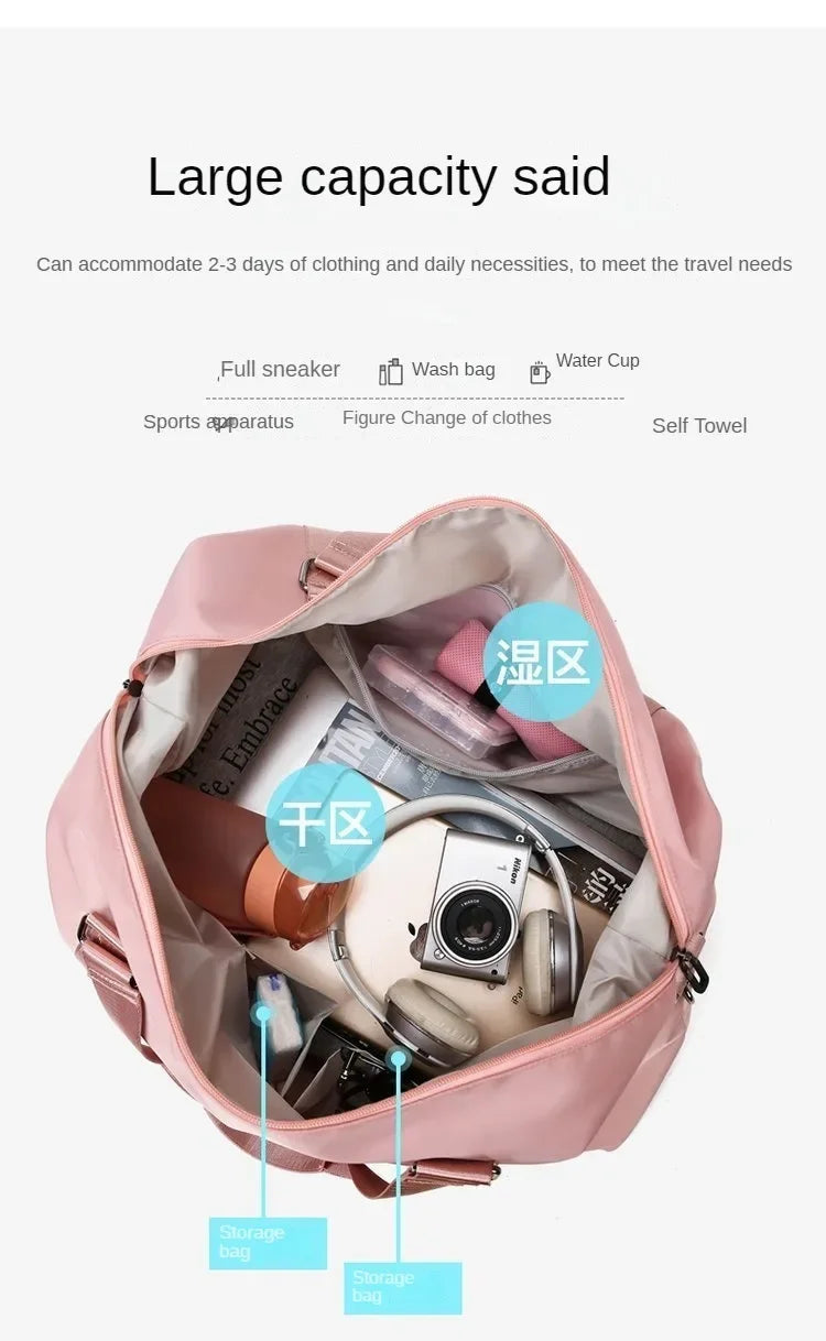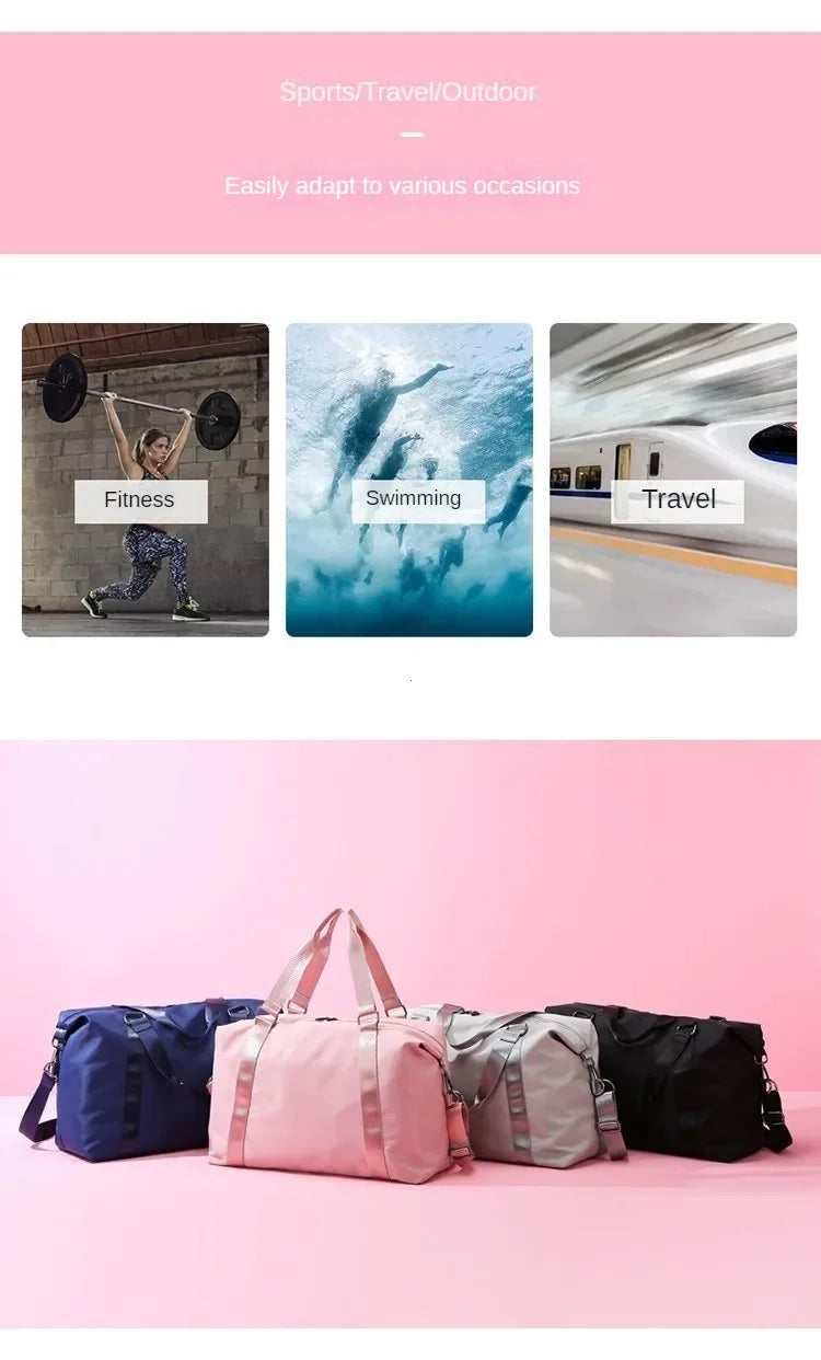 Ta wielofunkcyjna torba to idealne rozwiązanie dla kobiet ceniących sobie aktywność i podróże. Łączy w sobie funkcję dużej torby na siłownię z praktyczną torbą podróżną (Travel Tote). Wykonana jest z wodoodpornego nylonu (Main Material: Nylon), co zapewnia bezpieczeństwo przechowywanych rzeczy, w tym odzieży po treningu lub w czasie deszczu.