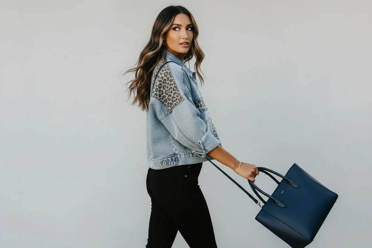 Wzór i Detale: (Leopard Print): Najbardziej charakterystycznym elementem są kontrastowe, naszywane aplikacje lub przeszycia w modny wzór panterki (leopard print). Panterka jest umieszczona strategicznie, dodając całości dzikiej elegancji i nowoczesnego charakteru.