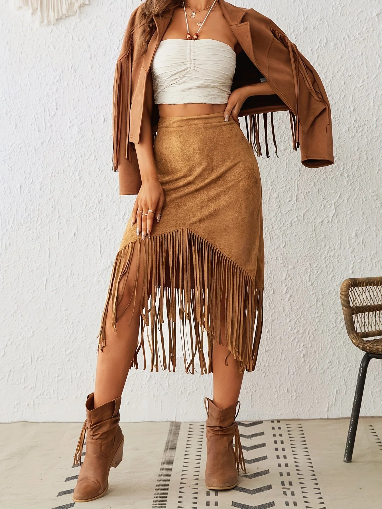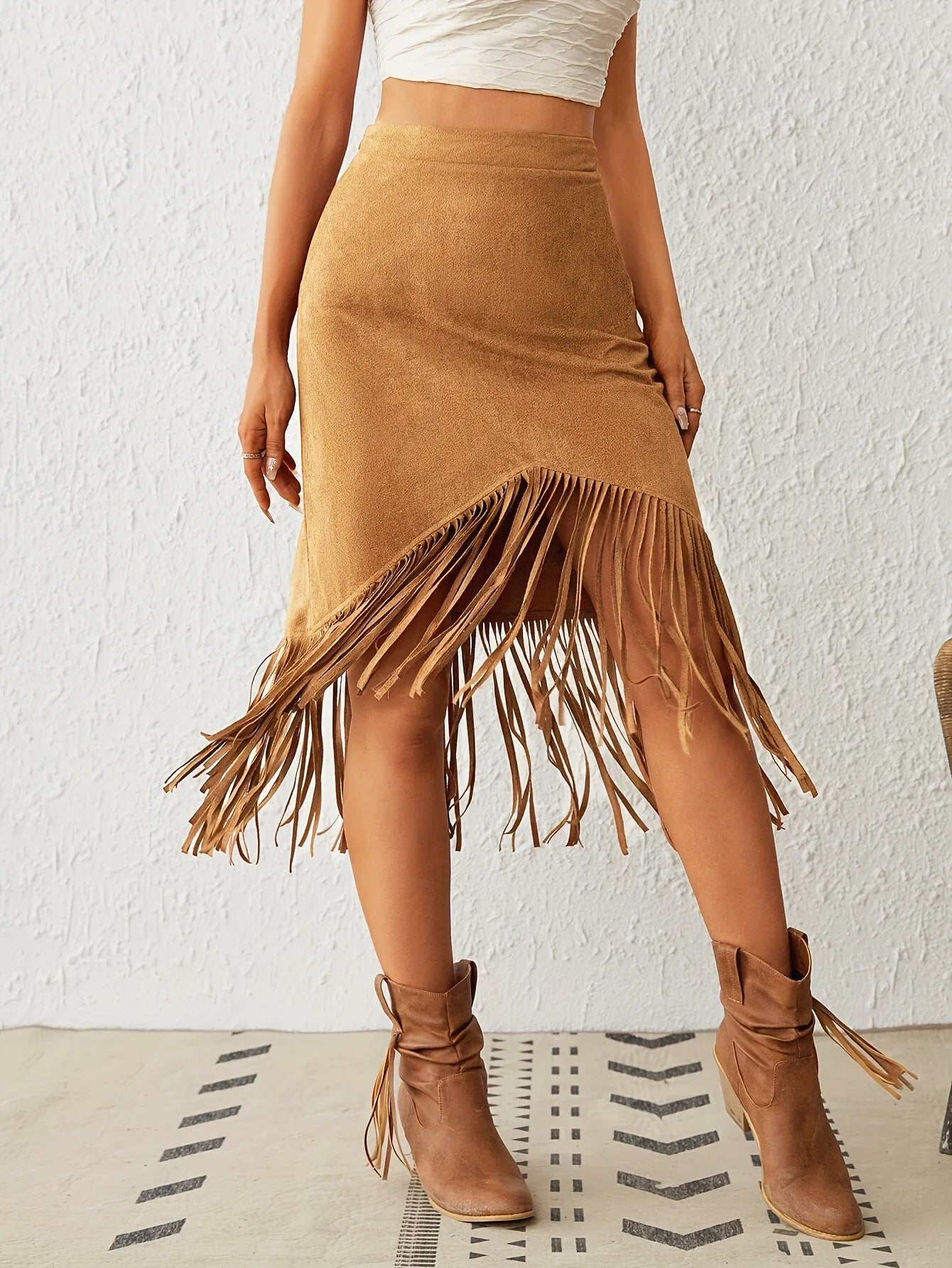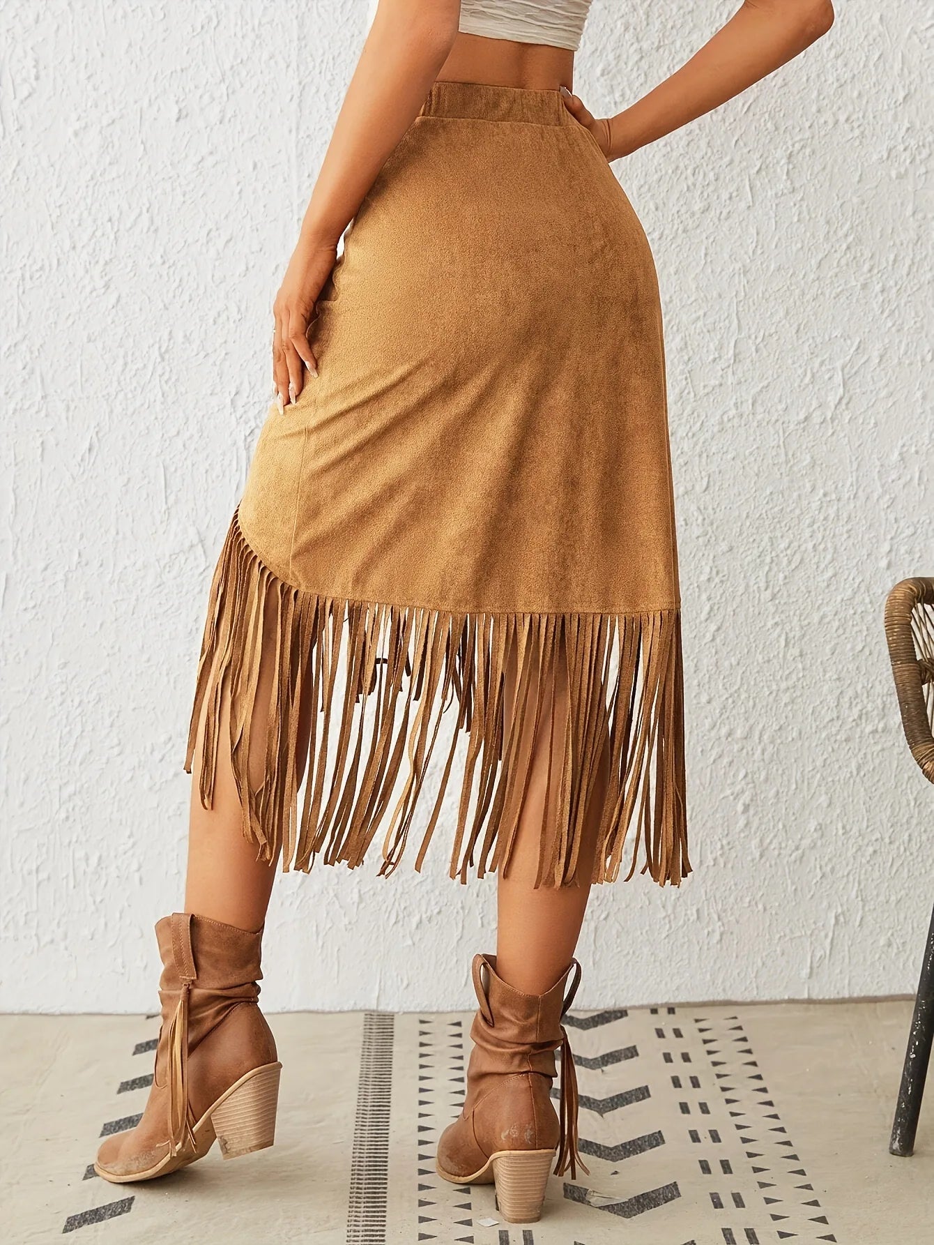 Vintage Asymetryczna Spódnica MIDI z Frędzlami A-Line - Casual Jesień High Street