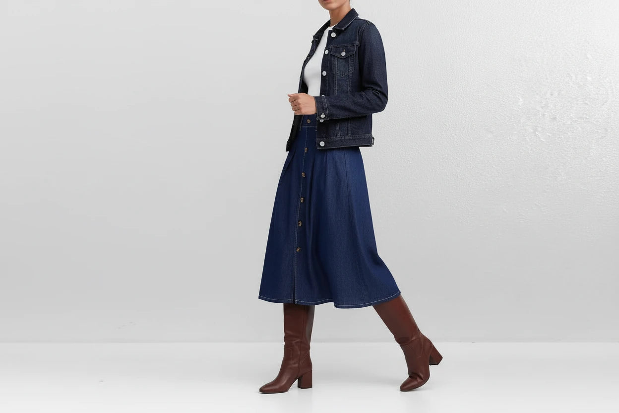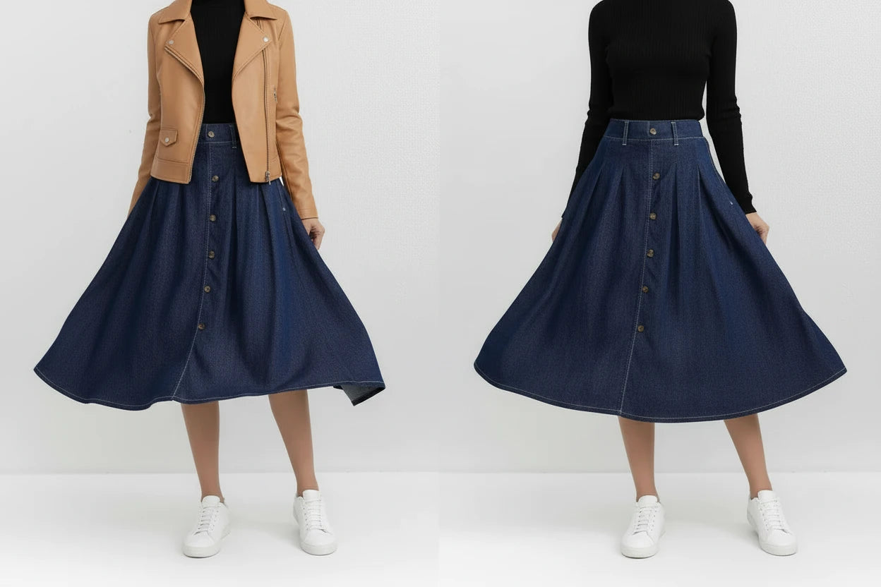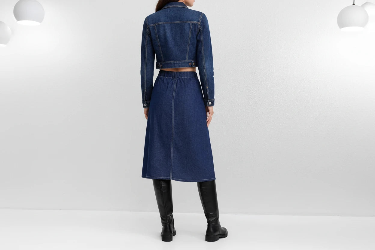 Fason: Rozkloszowany podkreślający sylwetkę, z wysokim stanem i długością do kolan.